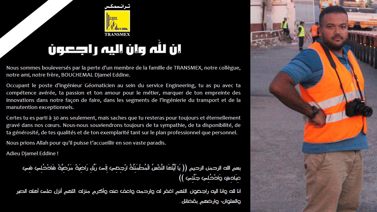 Nous sommes bouleversés par la perte d’un membre de la famille de TRANSMEX, notre collègue, notre ami, notre frère, BOUCHEMAL Djamel Eddine.